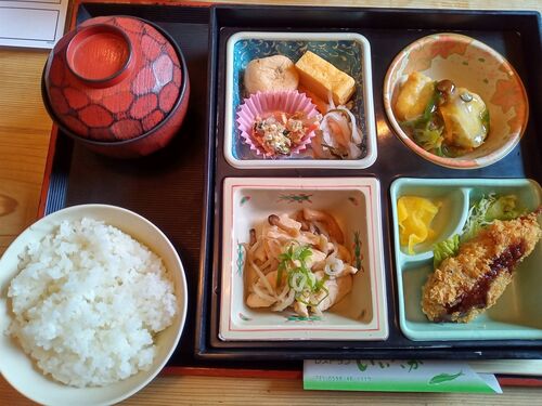 休みの日のランチ…チビコ、バーバと3世代+チビ太達(4世代だ!)で飯高道の駅に遊びに来た✌ 大人はランチ目当て…(笑) チビ子は季節の御膳。私は前回食べたので…前々から気になっている松花堂弁当にした♥ 鶏としめじの炒め物、串カツ、惣菜4品、揚出し豆腐…