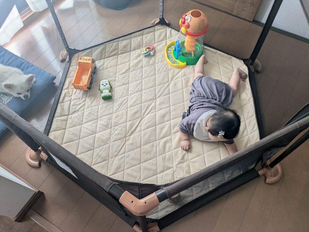 2024-08-21 チビチビ太👶 休みのため…チビチビ太👶連れてきてくれた😁✌ ハピちゃんの毛対策???としてサークル出した(笑) サークルの中ならずりばい大丈夫…口に入れることも安心安全…😁✌ チビチビ太👶妙な顔しながらサークルの中でグルグル…かわゆい♥ 幸せ幸せ…(*˘︶˘*).。.:*♡